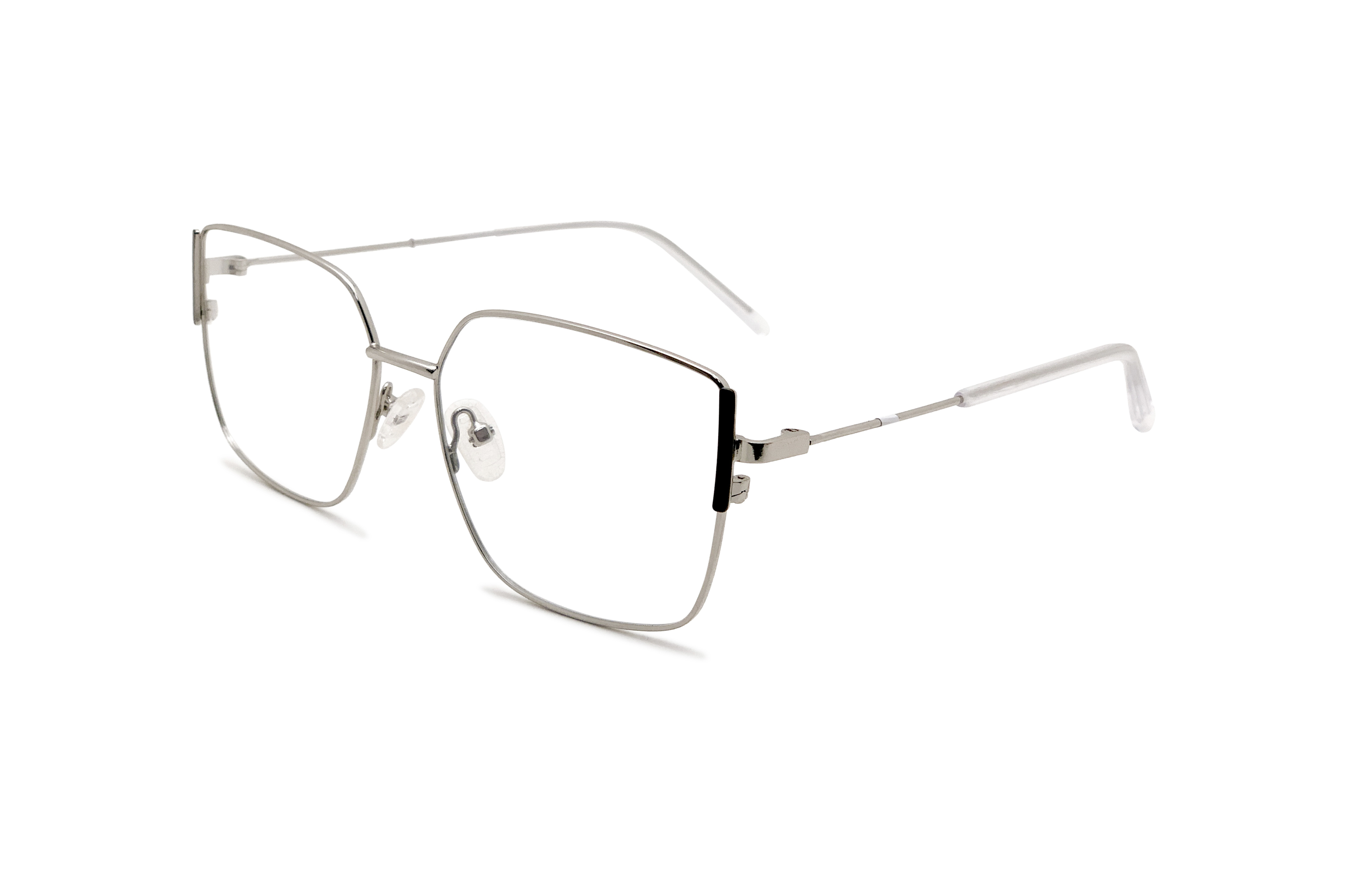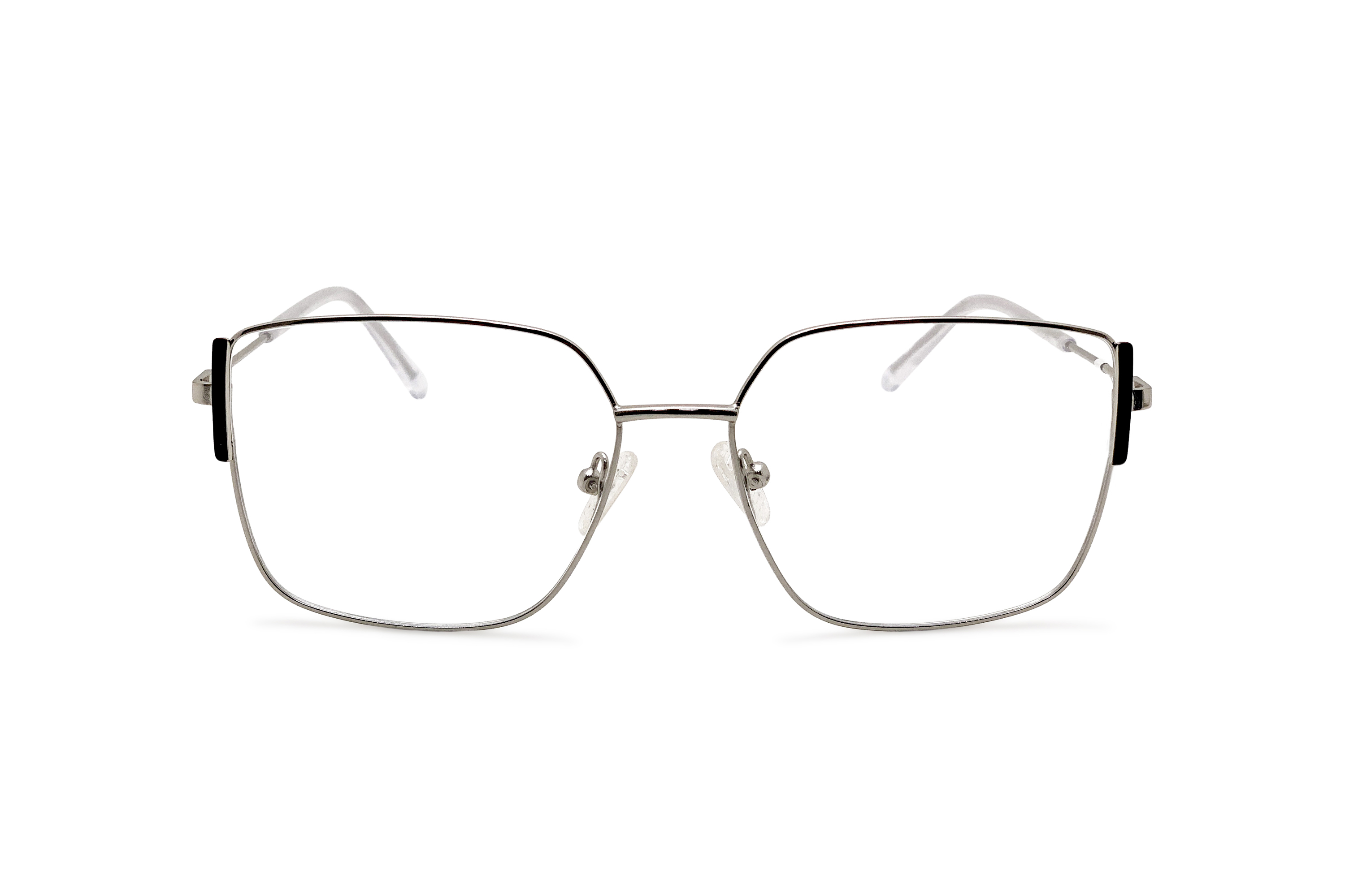 Женская оправа для очков прямоугольной формы сделана из металла. Основной цвет: серебристый. В оправе установлены временные линзы, не предназначенные для постоянного ношения. В комплекте к заказу идет салфетка для ухода за очками.