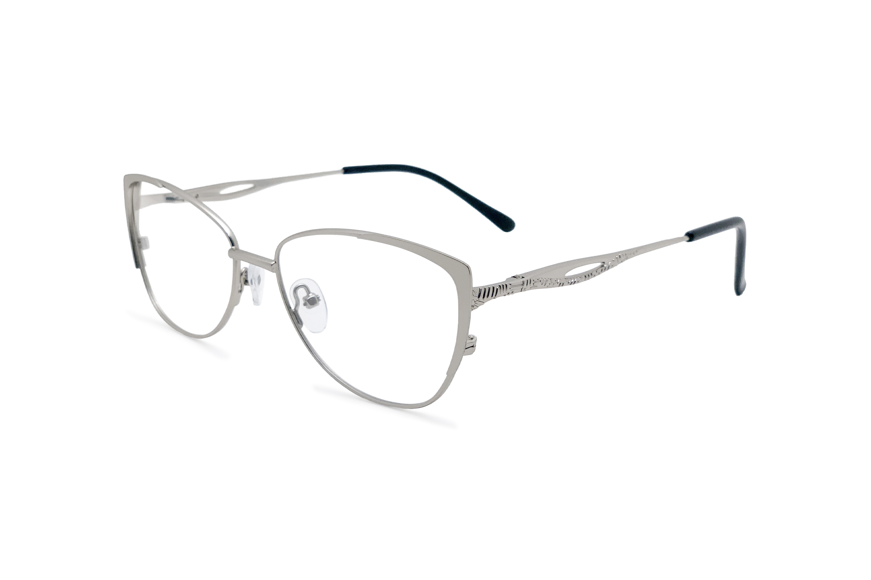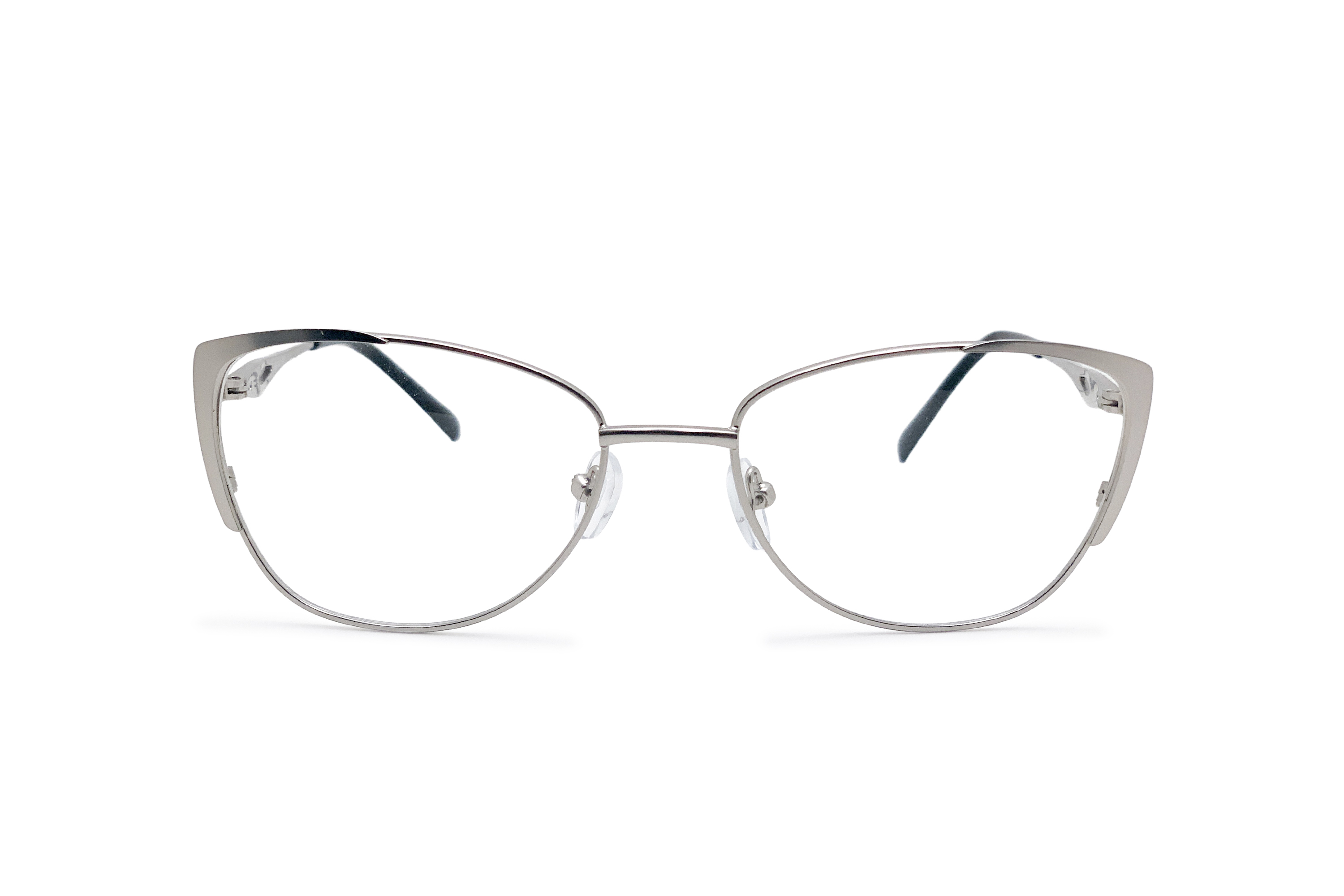 Женская оправа для очков в форме «кошачий глаз» сделана из металла. Основной цвет: серебристый. В оправе установлены временные линзы, не предназначенные для постоянного ношения. В комплекте к заказу идет салфетка для ухода за очками.