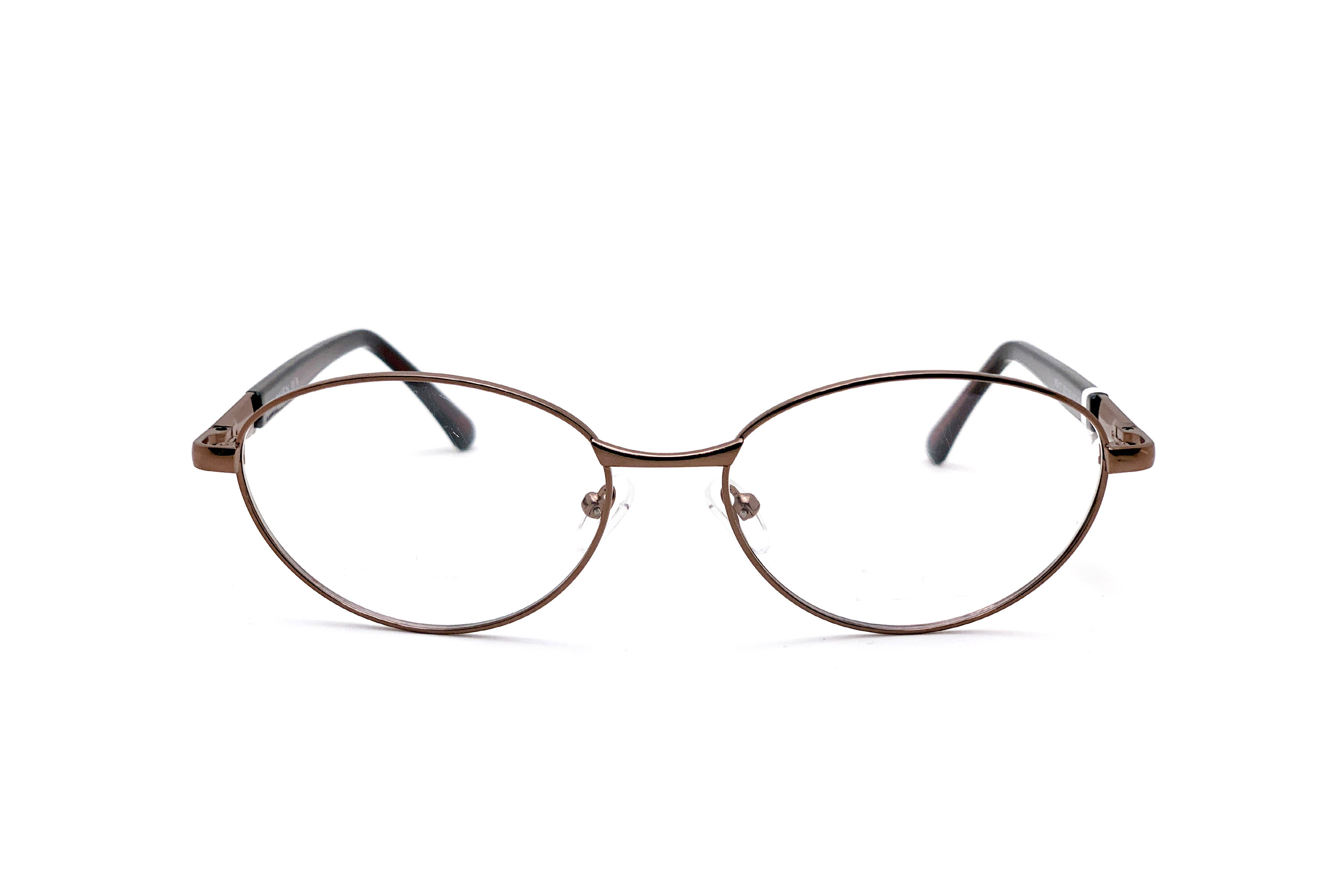 Женская оправа для очков округлой формы сделана из металла. Основной цвет: медный. В оправе установлены временные линзы, не предназначенные для постоянного ношения. В комплекте к заказу идет салфетка для ухода за очками.