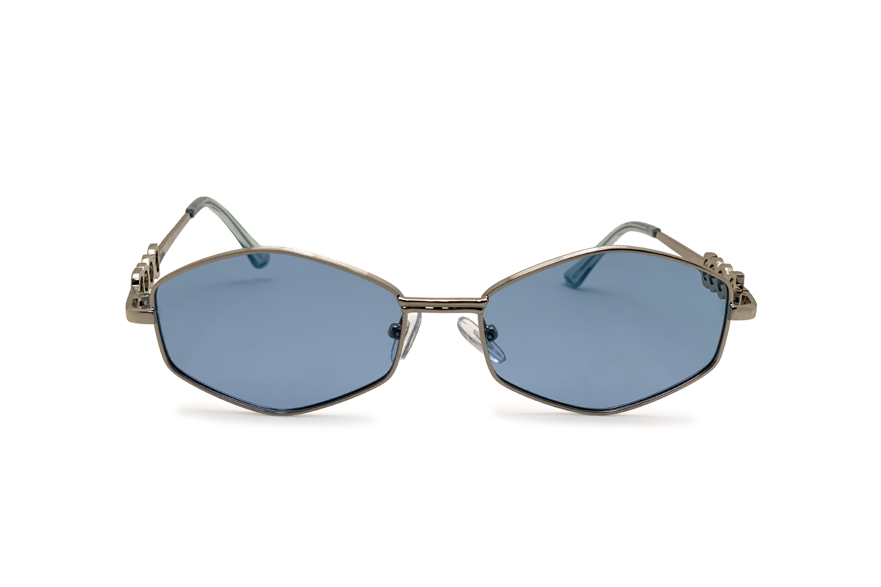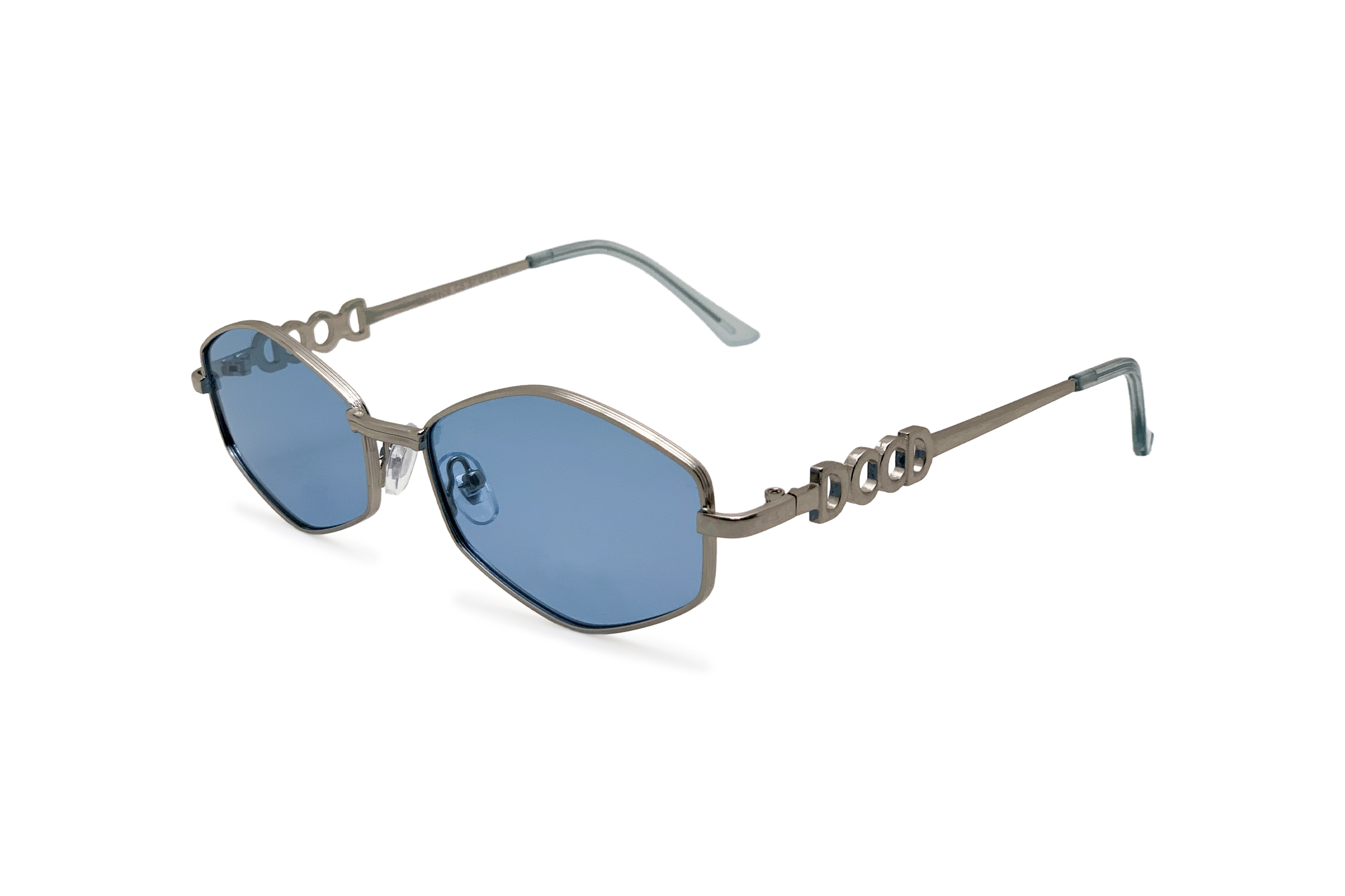 Серебристые солнцезащитные очки с линзами синего оттенка сделаны из металла. Подойдут как для девушек, так и для парней.